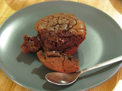 Our dessert was Chocolate Lava Cakes, and they were pretty easy! The recipe is here, and we didn’t change it, except that I added an ounce more chocolate than it called for. I used two 3.5oz Ghirardelli Twilight Delight bars that I happened to have in the cupboard - 72% cacao. Yum! I also didn’t use a double-boiler, just a metal mixing bowl on the stove and constant stirring with a whisk. Since I don’t have ramekins, we used large tinfoil cupcake liners on a cookie sheet. The recipe made 6 of these, since they hold less batter than the ramekins. Of course, I overcooked these slightly (we could blame me, but I’ll just blame my oven, so what’s the point?) so they weren’t quite as lava-like as promised. They were still very good though! Deliciously moist. We saved two to bake later, and these are refrigerated at the moment so hopefully we’ll get a better lava experience out of these whenever we bake them. I’ll keep you all informed. Our results from the first “batch” are pictured below: